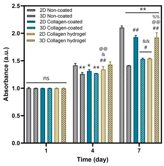 Cell viability of non-coated, collagen-coated, collagen hydrogel substrates of 2D and 3D by MTT assay in day 1, 4, 7. Bars represent the mean ± SD (n = 3). Significant differences are denoted 0.01 < p < 0.05 (*, #, &), p < 0.01 (**, ##, &&, @@, %%). The symbols * indicate a difference from the 2D non-coated, # from the 3D non-coated, & from the 2D collagen-coated, @ from the 3D collagen-coated, and % from the 2D collagen hydrogel substrates.