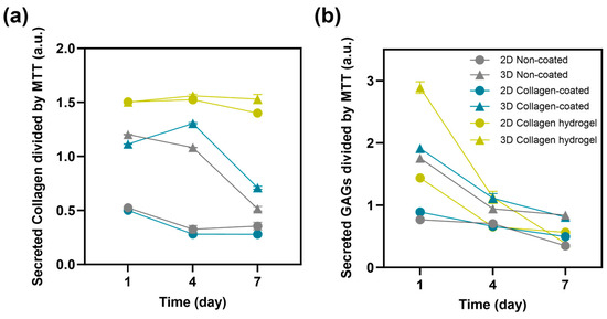 In addition to cell proliferation, the secretion of collagen and glycosaminoglycans (GAGs) from the cells was measured to assess their functional performance (Figure 7). Fibroblasts are cells that play an important role in the composition of the extracellular environment, with collagen and GAGs as their major secreted factors [18,19,20]. To normalize the total collagen and GAGs secretion to the function of each cell, it was divided by the measured MTT values. Collagen secretion was most active in cells cultured on collagen hydrogel substrates, and there was little difference between 2D and 3D cultures. Notably, collagen secretion remained consistently high from day 1 to day 7 without a decrease. For the other substrates, non-coated and collagen-coated, cell seeding conditions rather than substrate type had a greater influence on collagen secretion. In all cases, 3D spheroid cultures showed higher collagen secretion than 2D cultures. However, in 3D culture conditions, collagen secretion was maintained until day 4 and then decreased significantly by day 7. In 2D culture conditions, there was a steady, low level of collagen secretion from day 1 to day 7.