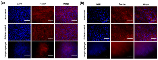 Immunofluorescence analysis was used to evaluate cell morphology and expression to better understand the effects of cell–cell and cell–matrix interactions on cells. Cell morphology was visualized using phalloidin, which binds selectively to F-actin filaments (Figure 8). Overall, a fibrous, linear structure was observed in all groups. In 2D cell culture conditions on non-coated and collagen-coated substrates, cells spread over a wide area, with F-actin appearing sharply linear. However, on collagen hydrogel substrates, cells were densely packed even in 2D culture conditions. In addition, F-actin expression was relatively low.
