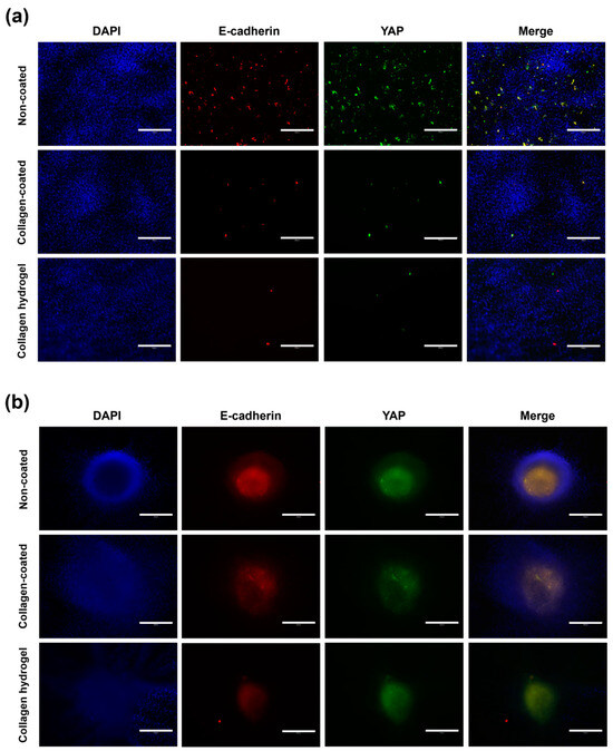 To evaluate the influence of matrix stiffness and cell–cell interaction, the expression levels of Yes-associated protein (YAP) and E-cadherin were observed by immunostaining on day 7 (Figure 9). In 2D cell culture, cells on non-coated substrates exhibited a general distribution of YAP and E-cadherin staining and showed the highest relative fluorescence intensity. In contrast, collagen-coated and collagen hydrogel substrates showed relatively narrow areas of fluorescence with significantly lower fluorescence intensity compared to non-coated substrates. Collagen-coated substrates showed a more extensive presence of YAP and E-cadherin compared to collagen hydrogel substrates, although the difference in fluorescence intensity of YAP was not observed, E-cadherin fluorescence intensity was slightly higher in collagen-coated substrates than in collagen hydrogel substrates.
