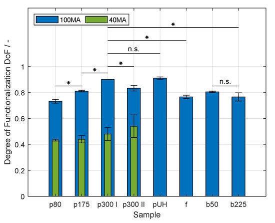 Degree of functionalization (DoF) of produced gelatin methacryloyl (GelMA). Sample nomenclature regarding the used raw materials is provided in Table 1. The DoF was determined by the trinitrobenzenesulfonic (TNBS) acid method [38]. At a methacrylic anhydride (MAA)-to-gelatin ratio of 100 μL g−1 (100 MA), asterisks denote a significant difference between synthesized samples (). No significant differences are denoted with the abbreviation n.s. (). Moreover, the DoF of porcine GelMA decreased significantly with decreasing MAA-to-gelatin ratio from 100 to 40 μL g−1 (40 MA) (). At a MAA-to-gelatin ratio of 40 μL g−1 (40 MA), no significant differences regarding the DoF were proven (). These differences are not shown for the purpose of clarity. Values are shown as mean and standard deviation. The functionalization of each gelatin type was carried out separately three times. The DoF of each batch was determined.