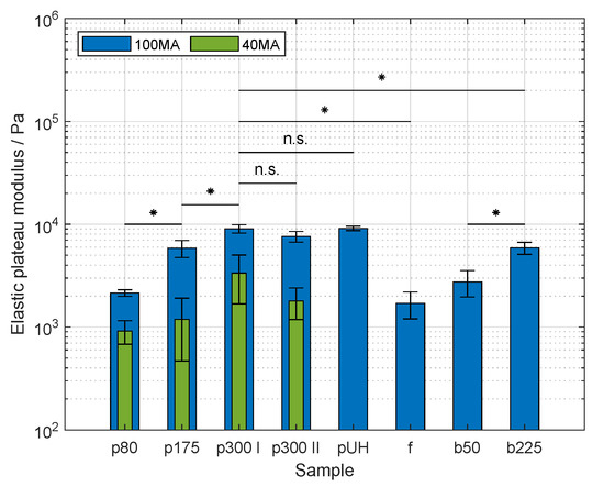 Elastic plateau modulus of gelatin methacryloyl (GelMA) hydrogels of various sources at 10% (w/v). Sample nomenclature regarding the used raw materials is provided on Table 1. At a methacrylic anhydride (MAA)-to-gelatin ratio of 100 μL g−1 (100 MA), asterisks denote a significant difference between synthesized samples (). No significant differences are denoted with the abbreviation n.s. (). Furthermore, the elasticity of the hydrogels produced with porcine GelMA decreased significantly with decreasing MAA-to-gelatin ratio from 100 to 40 μL g−1 (40 MA) (). At a MAA-to-gelatin ratio of 40 μL g−1 (40 MA), no significant differences regarding the hydrogel elasticity were shown (). These differences are not shown for the purpose of clarity. Data are shown as mean and corresponding standard deviation. Each batch of GelMA was used for the formulation of hydrogels. Three samples of each batch were tested.