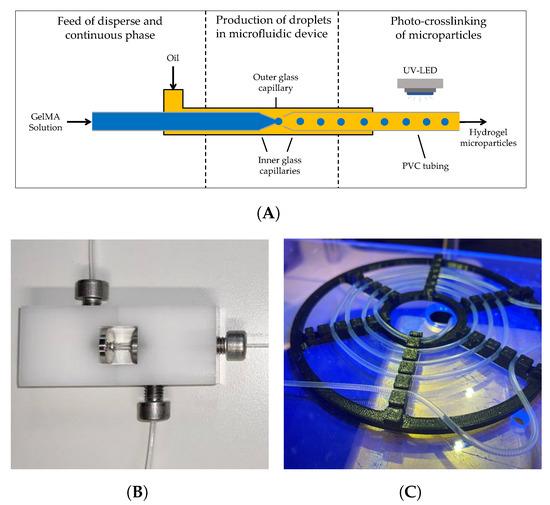 For the formation of GelMA droplets, a microfluidic device with glass capillaries was employed, as shown in Figure 4B. A detailed description of the equipment is provided by Leister et al. [53]. The setup consisted of one outer and two inner glass capillaries (World Precision Instruments, Friedberg, Germany). The inner capillaries (outer diameter 1 mm, inner diameter 0.58 mm) were modified by pulling with a micro-pipette puller (P-1000, Sutter Instruments, Novato, CA, USA). The tip diameter of the capillary for the disperse phase was 170 μm, while the tip diameter of the second capillary used as the outlet of dispersed droplets in oil was 340 μm. The inner capillaries as well as the outer capillary (length 15 mm, inner diameter 1.56 mm) were treated with 2-[methoxy(polyethyleneoxy)6-9-propyl]tris(dime thylamino)silane (Gelest Inc., Morrisville, PA, USA) in order to render the surface hydrophobic. The capillaries were attached in the polyoxymethylene (POM) module as published by Bandulasena et al. [64]. The distance between inner capillaries was set to 170 μm. The outlet of the microfluidic device was connected to a polyvinyl chloride (PVC) tubing (outer diameter 1.8 mm, inner diameter 1 mm, Deutsch & Neumann, Hennigsdorf, Germany). The tubing was arranged as a loop under four UV LEDs (OSRAM), where photo-crosslinking took place with a total irradiation intensity of 25.6 mW cm−2. An image of the tubing placed under UV light is provided in Figure 4C. The produced hydrogel microparticles in oil were collected and stored at room temperature until further analysis.