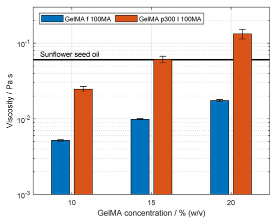 The shear-rate dependent viscosity of sunflower seed oil and the GelMA solutions was characterized as described in Section 4.1.2. For these measurements, the solvent trap served additionally as protection from light to avoid photo-crosslinking during the measurement.