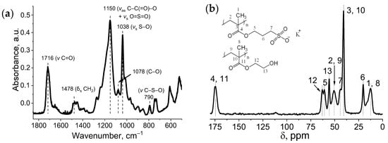 The structure of the gels was confirmed by 13C NMR and ATR-FTIR spectroscopy (Figure 1). The following signals were observed in the 13C NMR spectra (Figure 2a): 175 ppm. (carbonyl group), 63 ppm (O−CH2) 61 ppm (O−CH2), 55 ppm (CH2−O) 50 ppm (CH2), 44 (CH2−SO3K), 41 (quaternary carbon), 20 (secondary carbon) and 12 ppm. (methyl group).