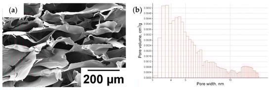 The porous structure of the gel was investigated by SEM and BET analysis. Electron microphotographs of freeze-dried sample are presented in Figure 3a. The obtained gels are high-pore gels. This was confirmed by measurements of porosity by gravimetrical analysis (the porosity is 98%), specific surface area (104 m2/g), and pore volume (0.088 cm3/g). Moreover, in addition to macropores that were observed on SEM photos, the gel contains a large amount of nano- and mesopores (Figure 3b), as evidenced by the resulting pore size distribution. Such high porosity of gel can positively affect the growth of the plants.