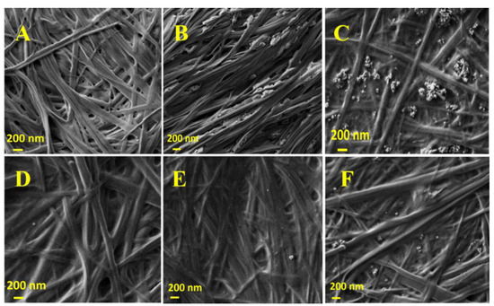 Fmoc-Phe3 self-assembling peptide and TiO2NPs were chosen to prepare hgel-TiO2NP composites. the biosynthesis of Fmoc-Ph3 hydrogel using Fmoc-Phe and Phe2 as starting reagents and a lipolytic enzyme (PFL) to catalyze the formation of a peptide bond between them was optimized in previous studies [41]. In the present work, this reaction was used to prepare hydrogels and impregnate them with different amounts of TiO2NPs. Ultrasonication was also applied to the samples and its effect on several physicochemical properties of the obtained hydrogels was investigated. It was observed that all hydrogel samples were formed after 30 min of incubation at 30 °C. Field emission scanning electron microscopy (FESEM) studies were conducted to investigate the effect of sonication on the hydrogel fibrillary structures, as well as the dispersion of different amounts of TiO2NPs inside the hydrogels. Figure 1A–C show the fibrillar structure of hgel-TiO2NPs (5 mg) and hgel-TiO2NPs (10 mg) before applying sonication, respectively. As evident, TiO2NPs showed aggregation in both concentrations inside the gel. At the same time, after sonication (Figure 1E,F), they were finely dispersed without any aggregation, which reveals the effect of sonication on NP dispersion. It is also interesting to mention that sonication did not affect the fibrillar structure of hgel (Figure 1D) and hgel-TiO2NPs.