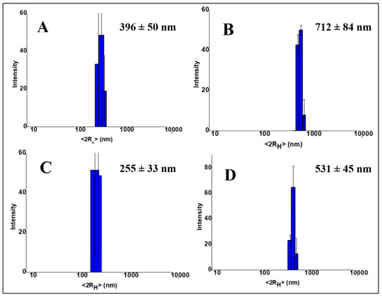 DLS measurements were performed to evaluate the size and polydispersity of TiO2NPs once they were inserted inside the hydrogels and evaluate if they underwent aggregation. Figure 2A,B show the size distribution of hgel-TiO2NP composites containing different amounts of TiO2NPs (5 mg and 10 mg, respectively), prepared without sonication. The average diameters measured for these samples were 396 ± 50 nm and 712 ± 84 nm, respectively. However, after sonication (Figure 2C,D) the particle size decreased (255 ± 33 nm and 531 ± 45 nm, respectively), demonstrating the positive effect of sonication on the dispersion of particles, which is consistent with SEM data.