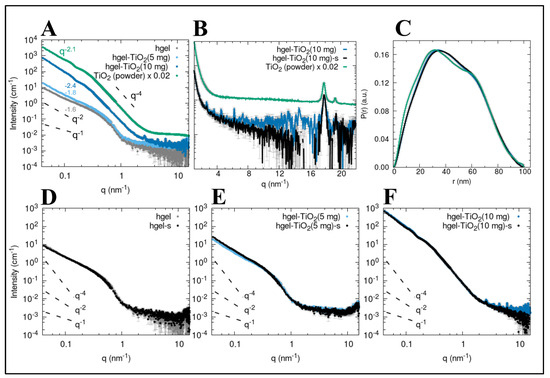 SAXS profiles of (A) hgel (grey dots), hgel-TiO2(5 mg) (light blue dots), hgel-TiO2(10 mg) (blue dots) and of the TiO2 powder (green dots). Characteristic power laws are reported for reference (black dashed lines), while the exponent observed at q < 0.3 nm−1 is reported in each case. (B) Enlargement of the WAXS region of the scattering profile to highlight diffraction peaks for the samples hgel-TiO2(10 mg) (blue), hgel-TiO2(10 mg)-s (black) and TiO2 powder (green). (C) Pair distance distribution functions obtained from the SAXS data of the samples hgel-TiO2(10 mg) (blue), hgel-TiO2(10 mg)-s (black) and of the TiO2 powder (green). Scaling factors were applied to match the height of the main maximum: 1.125 for hgel-TiO2(10 mg)-s and 0.0044 for TiO2 powder. (D–F) Comparison between the SAXS profiles of non-sonicated and sonicated samples.