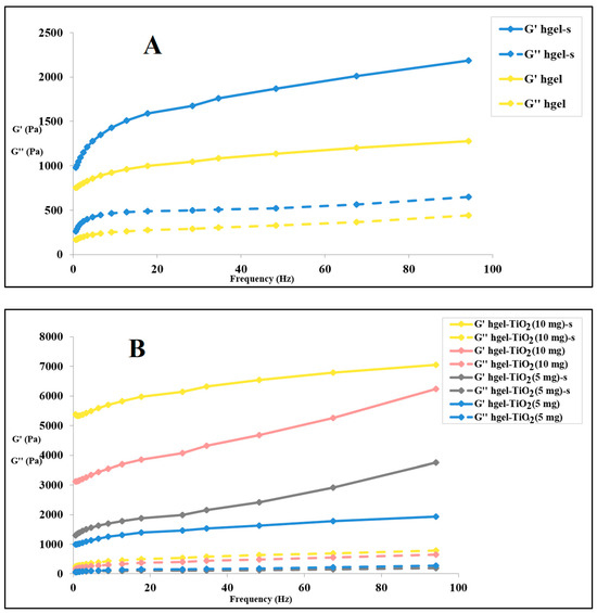 Frequency sweep of (A) hydrogel prepared with or without sonication, (B) hgel-TiO2NPs with different concentrations of NPs prepared with or without sonication (“s” in the insets indicates sonication).