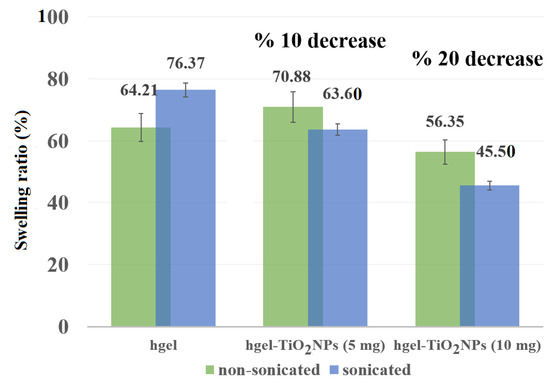Swelling ratio of hgel, hgel-TiO2NPs (5 mg) and hgel-TiO2NPs (10 mg), prepared with or without sonication.