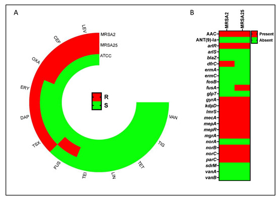 Antimicrobial resistance genes and antimicrobial susceptibility test. (A) Circular heatmap of antimicrobial susceptibility testing (AST) for the following antibiotics: ceftaroline (CEF), daptomycin (DAP), erythromycin (ERY), fusidic acid (FUS), levofloxacin (LEV), linezolid (LIN), oxacillin (OXA), teicoplanin (TEI), tetracycline (TET), tigecycline (TIG), trimethoprim–sulfamethoxazole (TSX) and vancomycin (VAN), expressed as resistant (red—R) or susceptible (green—S). (B) Heatmap displaying antibiotic resistance genes found in the methicillin-resistant S. aureus (MRSA) strains (MRSA2 and MRSA25) and the laboratory S. aureus strain ATCC 6538 (ATCC).