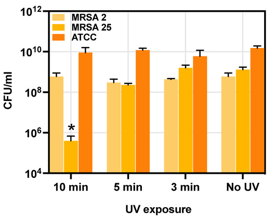 Effect of UV light at different exposure times on the growth curve of S. aureus. The graph represents 10 min, 5 min and 3 min UV exposure compared to unexposed cells. Each value corresponds to the mean of 3 replicates. The error bars represent standard deviation. Statistical differences were determined using the Kruskal–Wallis test. *, p < 0.05.