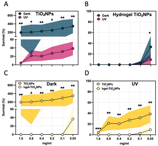Antibacterial activity of photoactivated (UV light) and non-photoactivated (dark) (A) TiO2NPs and (B) hgel-TiO2NPs at different concentrations of TiO2 (0.05, 0.1, 0.2, 0.4, 0.8 and 1.6 mg/mL). Comparative analysis of antibacterial activity for TiO2NPs and hgel-TiO2NPs in the dark (C) or in the presence of UV (D). Values are expressed as a percentage of survival of treated cells compared to the untreated controls. Data points and the corresponding shaded areas represent the mean ± standard deviation from three independent experiments, each analyzed in triplicate. Statistical differences were determined using the Mann–Whitney test. *, p < 0.05; **, p < 0.01.