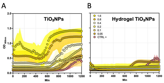 To evaluate the bactericidal activity of UV light-activated hgel-TiO2NPs and TiO2NPs, a preliminary set of experiments was conducted using microplates exposed to direct UV light for 10, 5 and 3 min [38]. The plates were incubated for 24 h at 37 °C in a microplate reader (Multiskan SkyHigh, Thermo Fisher Scientific, Waltham, MA, USA), where QD600 readings were taken every 20 min. Viable cell counts were determined through plate counting to measure CFU/mL. Experiments were performed in triplicate and repeated three times.