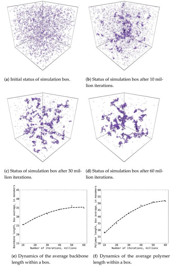 The growth of MAA polymers during Monte Carlo simulation: (a–d) subplots represent evolution of 50 × 50 × 50 nm simulation box with 5875 MAA molecules at different stages of simulation; (e) subplot depicts evolution of averaged MAA polymer backbone length (in MAA monomers) during simulation; (f) subplot depicts evolution of averaged MAA polymer length (in MAA monomers) during simulation.