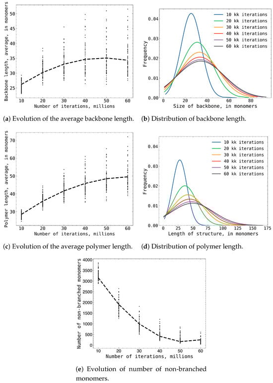 In Figure 2, we present the statistical analysis of MAA polymer growth from our Monte Carlo simulations. These plots show that the growth of MAA polymers continued up to 50 million Monte Carlo steps. At this point, a state of equilibrium was reached between the growth of MAA polymers and the degradation of branched MAA polymers. This equilibrium resulted in a stable structure of MAA polymers within the simulation box. However, the structure of MAA polymers was not static; it continued to evolve rapidly, influenced by the ongoing balance between the formation and breakdown of MAA polymers. This dynamic process was clearly demonstrated in plot Figure 2e, where the continuous changes in the polymer structure could be observed.