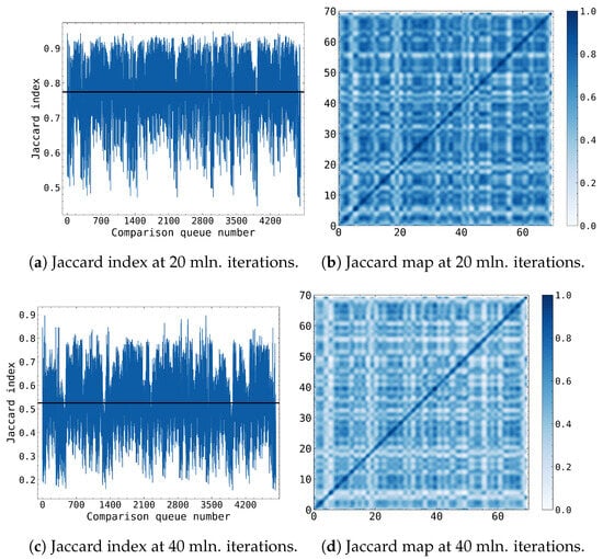 Jaccard similarity index distributions and maps at various simulation phases. Each of the 70 boxes had been compared against each other and the Jaccard index had been calculated, thus resulting in 4900 comparisons that had been set on the x-axis. (a,b) at 20 million iterations showing the very high similarity between the polymers formed in the boxes; (c,d) at 40 million iterations showing decreasing similarity between the polymers formed in the boxes.