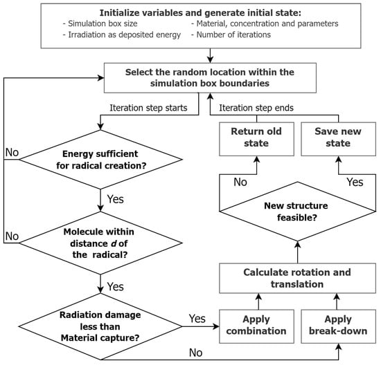 The model was based on the MC method, which relies on repeated random sampling to obtain numerical results, as polymer growth upon irradiation can be described by a probabilistic interpretation. The simulation box of the desired size was initiated and filled with the type of material of interest and its concentration, i.e., the number of molecules of the material per the volume of the box, as well as their initial configuration, and the MC cycle was started (Figure 4). The iteration step started with the selection of a random location within the box’s geometrical boundaries, which simulated the possibility of the random appearance of radicals. A check of the energy within that box location was performed to ensure that the absorbed energy value was sufficient to create a radical. The next step checked if there was a molecule of interest within a certain distance that would be affected by the creation of the radical. If this were the case, the energy calculation for radiation damage and material capture was performed in order to set the possible combination or break-down event sequence depending on those energy calculations. At this stage, there were three potential scenarios: a changed molecular structure following a successful combination event, a changed molecular structure resulting from a successful break-down event, or an unchanged structure if neither of these events occurred successfully. In all cases, the next step was the calculation of rotation and translation, followed by a final feasibility check that verified that the changes were physically possible, i.e., that there was no unacceptable intersection of the simulated bodies. The result of the check determined, accordingly, whether the changes made were retained and the simulation box was updated or whether they were reversed.