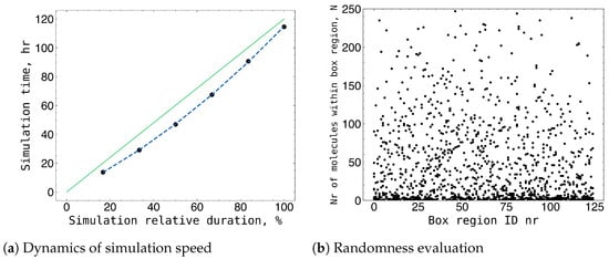 (a) Speed of the simulation for 50 nm × 50 nm × 50 nm box of default concentration (5875 molecules) varied from 1.3 h per million iteration in the beginning of the simulation and ended up to 1.9 h per million iteration. (b) An evaluation of the randomness of box structures based on the number of monomers in smaller box areas.