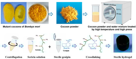 - Zhang, Y.S.; Zhao, Y.Y.; He, X.B.; Fang, A.; Jiang, R.L.; Wu, T.F.; Chen, H.G.; Cao, X.T.; Liang, P.S.; Xia, D.G.; et al. A sterile self-assembled sericin hydrogel via a simple two-step process. Polym. Test. 2019, 80, 106016. [Google Scholar] [CrossRef]