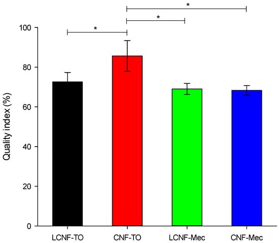 Influence of pre-treatments on (L)CNFs’ quality index. Asterisks denote statistically significant differences (p < 0.05).