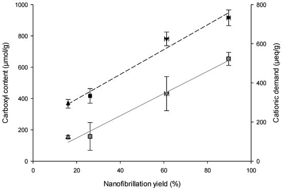 Nanofibrillation yield as a function of the carboxyl content and cationic demand for (△) LCNF-TO, (◻) CNF-TO, (▽) LCNF-Mec, and (○) CNF-Mec. Gray solid line represents the fitting curve of carboxyl content; black dash line represents the fitting curve of cationic demand.