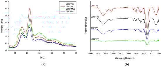 The effect of the chemical and mechanical treatments used on chemistry structure of (L)CNFs was examined by FT-IR spectra on (L)CNFs previously dried in an air oven at 60 °C for 24 h, following the previously described methodology.