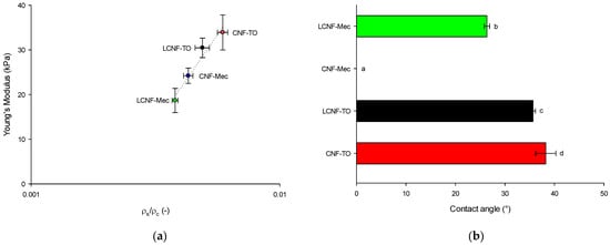 Young’s Modulus as a function of relative density (ρs/ρc) for (L)CNF-based aerogels (a). Dotted line represents the power law fitting curve (Equation (1)); average water contact angle of aerogels (b). Different letters denote significant differences (p < 0.05).