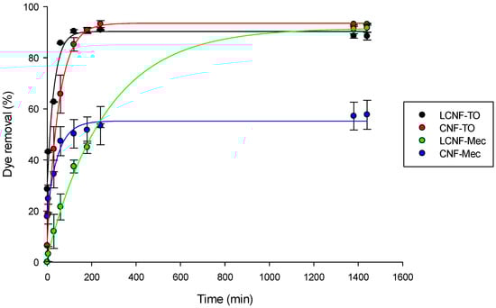 The prepared adsorbent aerogels exhibited remarkable adsorption capabilities for methylene blue (MB) dye, attributable to their unique surface chemistry. Notably, (i) (L)CNFs possess abundant functional groups that engage with the cationic dye and (ii) the 3D porous structure of aerogels provides a large surface area, facilitating enhanced analyte–receptor interactions. Figure 6 illustrates the adsorption kinetics of different (L)CNF-based aerogels for a 10 mg/L MB solution. Initially, the results revealed that the adsorption rate increased rapidly due to the high availability of hydroxyl and carboxyl groups present in the aerogel (negative charge), which interact with the positively charged MB molecules. Subsequently, the adsorption rate gradually decreased as the adsorption sites within the adsorbent became saturated. Therefore, the affinity for adsorption by the (L)CNF-based aerogels was due to the hydroxyl and carboxyl functional groups [82], as highlighted by the FT-IR analysis (Figure 4). The adsorption equilibrium was reached at approximately 1, 4, 23, and 3.5 h after adsorption for LCNF-TO, CNF-TO, LCNF-Mec, and CNF-Mec, respectively. The slower adsorption observed with the CNF-Mec aerogel can be attributed to the lower surface charge resulting from the mechanical pre-treatment, as well as the lower QI value. Additionally, although LCNF-Mec and CNF-Mec have slightly different QI values, the presence of lignin content in LCNFs significantly influenced the adsorption properties through the formation of electrostatic interactions with the cationic dye [40].