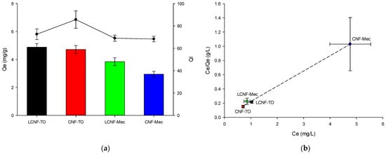 The high initial concentration of MB (10 mg/L) enhanced the adsorption capacity of the cellulose aerogels for the dye, as it increased the driving forces between the adsorbents and dye molecules. The LCNF-TO and CNF-TO-based aerogels allowed MB to reach the maximum equilibrium adsorption capacity (Figure 7a), because the (L)CNF-TO has higher specific surface area, leading to a higher affinity and interaction of carboxyl groups with MB. This result is also confirmed from visual observations (as shown in the graphical abstract), where it is clear visible how the MB solution became clearer after the treatment with aerogels. In addition, this finding indicated that (L)CNFs’ QI higher than 70% causes the adsorption process’s efficiency of MB to increase, reaching the maximum equilibrium adsorption capacity. Furthermore, the interaction between the adsorbent and adsorbate has been analyzed using the Langmuir adsorption isotherm model (Equation (12)) at 25 °C, as depicted in Figure 7b. The results demonstrated that NC-based aerogels have homogeneous adsorption characteristics for MB, with a maximum adsorption capacity of 4.68 mg/g. Moreover, the RL value of MB adsorbed by (L)CNF-based aerogels was found to be less than 1 (Table 6), indicating a favorable adsorption process owing the strong intermolecular interaction between oxygen-containing groups of aerogels and hydrophilic segments of dye molecules.