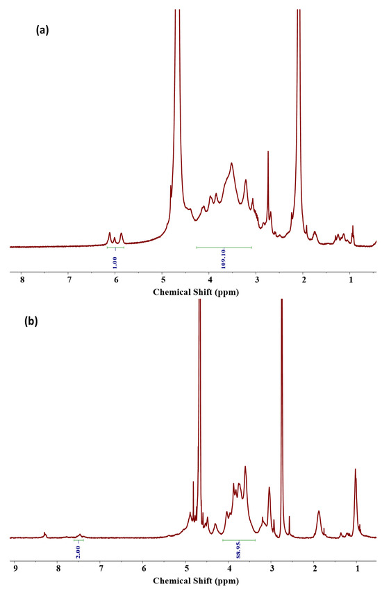 1H-NMR spectra of the precursors. (a) CMC–Nb and (b) Alg–mTz.