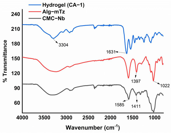 FT-IR spectra of CMC–Nb, Alg–mTz and formulated hydrogels.