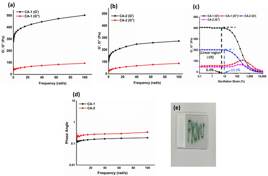 The viscoelastic characteristics of the hydrogels, with (a,b) representing the moduli as a function of angular frequency of CA-1 and CA-2 hydrogels, respectively, (c) the strain amplitude sweep experiment, (d) phase angle as a function of angular frequency, (e) photographs of injectable hydrogels loaded with ICG.