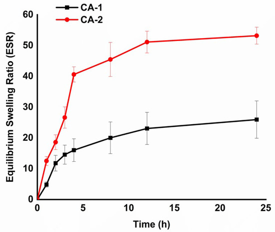 The swelling ratio of hydrogels has a considerable impact on drug-loading efficiency. The swelling characteristics of the hydrogels were assessed using a gravimetric approach. The equilibrium swelling behavior is presented in Figure 4, which demonstrates that hydrogel CA-1 and CA-2 swell dynamically during the initial 4 h, indicating a 12, and 40 times rise in mass as in comparison to their original mass, respectively. The hydrogels gradually captivated water during the initial period of swelling and essentially attained their swelling equilibrium by 24 h. The CMC/Alg-derived hydrogels showed higher swelling behavior than Alg/PEG-derived hydrogels in the previous report [13].