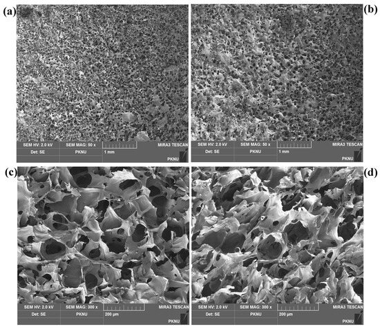The CMC/Alg-derived hydrogels exhibited porous morphologies, which have the potential to provide advantages in various biological applications, including drug delivery and tissue engineering. The highly porous morphologies observed in the injectable hydrogels could be attributed to the in situ formation of micro-bubbles within the networks induced by the generation of N2 gas during the IEDDA click reaction [14]. Indeed, the IEDDA click reaction, involving the interaction between methyl-tetrazine (diene: electron-deficient species) and Nb (dienophile: electron-rich species), demonstrated high efficacy under physiological conditions. This reaction resulted in the formation of covalent cross-linking bonds and the release of N2 gas as a by-product. The porous morphologies of the hydrogels were visualized using FE-SEM after they underwent lyophilization. It is notable that more and smaller holes are observed on the surface of the hydrogels at the higher molar concentration of Alg–mTz (see Figure 5a,b).