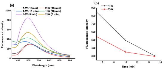 The ICG-loaded hydrogels (CA-1) exhibited its maximum fluorescence intensity when exposed to 1 W NIR light for a duration of 5 min. However, a significant reduction in fluorescence intensities was observed when subjecting the hydrogel to NIR radiation with the higher power density, as illustrated in Figure 6a. The DPBF fluorescent intensities were also reduced with prolonged irradiation time (10–15 min), as depicted in Figure 6b. The porous structure of the CMC/Alg-derived hydrogels might play a crucial role in contributing to their high photothermal and photodynamic performance. The higher porosity facilitates multiple light scattering and reflection, leading to enhanced capture of the incident light and, consequently, improved light absorption [38].