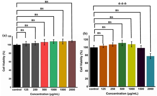 The In vitro cytocompatibility of precursors in tested HEK-293 cells. (a) cytocompatibility of CMC–Nb (ns = non-significant) and (b) cytocompatibility of Alg–mTz (*** = very significant (p = 0.001868)) for 2000 µg/mL Alg–mTz. All samples were treated for 24 h. Error bars showing standard deviation (n = 4).