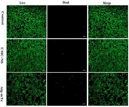 The live/dead assay, utilizing calcein-AM and ethidium bromide, was carried out to confirm further the biocompatibility of the precursors. In the confocal images, viable cells were prominently displayed in green, while deceased cells were marked in red (see Figure 8). These findings revealed that there was no significant variance in the count of live and dead cells when exposed to the control, CMC–Nb, and Alg–mTz.