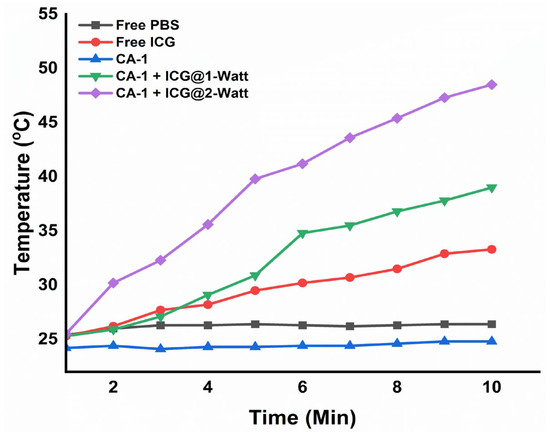 For instance, when exposed to a 1 W NIR laser, free ICG and CA-1 + ICG experienced temperature elevations of 33 °C and 38.5 °C, respectively, over 10 min. A doubling of the laser intensity to 2 W escalated the temperature to 43 °C and 48.5 °C for free ICG and CA-1 + ICG, respectively, in the same time frame. These findings underscore the clear dependence of the temperature elevation of the ICG-loaded hydrogels on NIR laser intensity, a crucial characteristic for inducing hyperthermal effects with the potential to ablate cancer cells [20]. The photothermal conversion efficiency (η) of the ICG-loaded (1 mg/mL) hydrogels irradiated under 808 nm laser (2 W/cm−2) for 10 min. was calculated to be 34.6% [39].