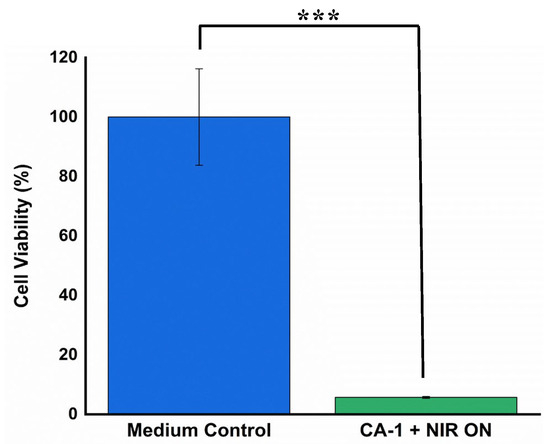 Anti-cancer treatment against HeLa cancer cells with/without NIR irradiation (2 W power, 180 s) (*** = very significant (p = 0.0004683)). Error bars showing standard deviation (n = 4).