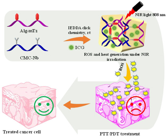When designing therapeutic carriers for controlled drug release, another crucial factor to consider is the responsiveness of the polymeric hydrogels to external stimuli. These stimulus-responsive hydrogel systems can be triggered by various external stimuli, including pH, temperature, redox reactions, near-infrared (NIR) light, ultrasound, and magnetic fields. Among these stimuli, NIR light is considered safer for cells due to its low radiation energy (in the range of 650–900 nm) and its ability to penetrate tissues effectively, thereby inducing a biochemical response [24]. Our research group has incorporated indocyanine green (ICG), a photosensitizer and NIR-responsive dye, into polysaccharide-derived hydrogels for NIR-responsive drug delivery applications [25]. ICG possesses the capability to generate ROS through the absorption of near-infrared (NIR) irradiation at 808 nm [26]. ROS could stimulate the degradation of hydrogels and on-demand release of therapeutic agents in a controlled manner. On the other hand, ROS itself can be useful for PDT [27]. It is also known that NIR absorption to ICG generates heat as well as ROS, which is utilized in PTT [28].
