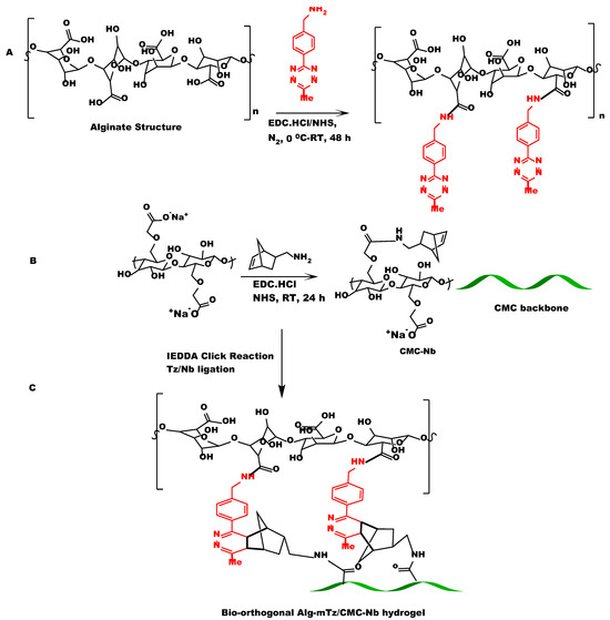 The synthetic route path for CMC–Alg conjugation, (A) bio-conjugation of Alg with methyl tetrazine amine, (B) functionalization of CMC with norbornene amine, and (C) formation of Alg/CMC-derived click hydrogels.