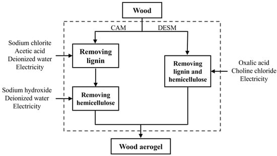 The purpose of the LCA was to appraise the environmental impacts of CAM and DESM in wood treatment processes. Two independent wood pretreatment routes are presented in Figure 1.