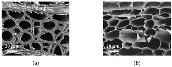 Natural balsa (NBS) was taken as an example to discuss the difference in the structure before and after the DESM pretreatment (DBS), and high-magnification SEM images of the cross-section of the NBS and the DBS were recorded (Figure 2a,b). There is no obvious change in the honeycomb-like porous structure, which indicated that DESM had no effect on the structure of NBS except the attenuation of the cell wall caused by partial delignification and the de-hemicellulose process in the DES. Additionally, the specific surface area (SSA) increased from 12.25 m2·g−1 of NBS to 82.32 m2·g−1 of DBS due to the removal compositions.