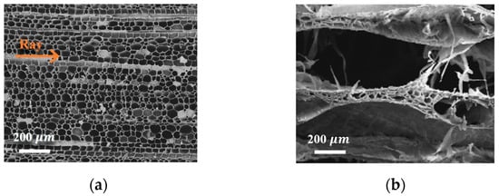 Similarly, NBS was taken as an example to discuss the difference in structure after the CAM pretreatment. By comparing the low-magnification SEM images of the cross-section of the NBS with delignified (DLBS) (Figure 3a) and de-hemicellulose (DHBS) (Figure 3b), it is clear that, after removing the lignin and hemicellulose, the original honeycomb-like structure of DLBS was split in the direction of the wood ray (arrow direction in Figure 3a), and turned into the spring-like lamellar structure of DHBS (Figure 3b). The reason for the structural change was that the thin lamellas were cracked along the rays and stressed by ice crystals after the CAM treatment.