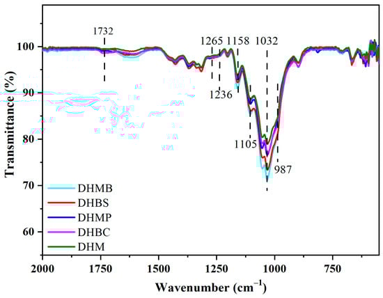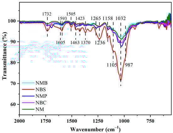The bands at 1423 cm−1 represent δ C–H of cellulose, and the band at 1370 cm−1 is associated with the bending vibration C–H of cellulose. The abovementioned two band intensities did not change during the chlorite treatment process (Figure 5) and further alkali treatment (Figure 6), exhibiting that CAM hardly damaged the cellulose. Additionally, the shape of the bands at 1158–987 cm−1, representing ν C=O in cellulose and hemicellulose, tended to become homogeneous after chlorite treated and further alkali treatment. The chemical properties of hardwoods were unified, and the special features of the softwood disappeared (Figure 6), which indicated that CAM possesses the capacity to unify the chemical functional groups of various wood species. Moreover, mature mulberry and mulberry branches (MB) demonstrate slight distinctions due to differences in wood maturity (Figure 4). The chemical functional groups were unified via CAM (Figure 6), which indicated that CAM possesses the capacity to unify the chemical functional groups of various wood maturities.