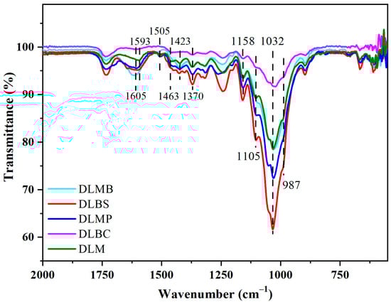 The FTIR spectra of NW among all the wood species shows common and special features with some differences in Figure 4. The most conspicuous, a discriminating band at 1605 cm−1 belonging to softwood, was sifted out from the band at 1593 cm−1 in other hardwoods, which corresponded to the conjugated ν C–O of the aromatic skeleton in lignin [,]. After pretreatment with chlorite, the peak was blue-shifted and attenuated, indicating that the molecular structure of lignin changed during the pretreatment with chlorite (Figure 5).