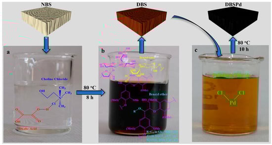 The ideal structure of DBS was obtained via an eco-friendly DESM using NBS with the removal of lignin and hemicellulose synchronously. Subsequently, a hydrothermal reaction was utilized to anchor Pd NPs on DBS and labeled as DBSPd (Figure 7). DES removes partial lignin and hemicellulose by breaking covalent bonds among these three main components of wood, and cleavage fragments (lignin and hemicellulose) are shown in Figure 7b. Lignin and hemicellulose are by-products of DESM, which is a benefit of DESM in addition to its environmental benefits.