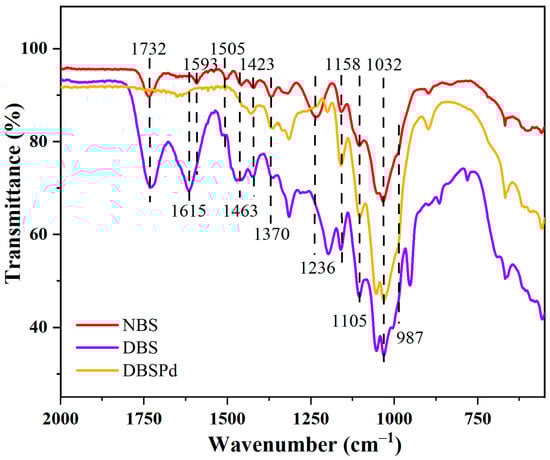 Above mentioned partial components remove, which was further confirmed by FT-IR analysis (Figure 8). The partial removal of lignin can be inferred from the disappearance of characteristic peaks of lignin after DESM pretreatment, which located at 1505 cm−1 and 1463 cm−1. It was indicating that the content of lignin in wood was decreased. Besides, it could deduce from the vanish of xylan characteristic peaks at 1236 cm−1 of DBS that the significant amounts of hemicellulose were removed. After DESM pretreatment, the lignin-related peak at 1593 cm−1 was shift to 1615 cm−1 and increased, which was due to break bands could increase groups of the DBS []. Moreover, above mentioned enhanced peak (1615 cm−1) almost disappeared in FT-IR spectra of DBSPd, which verified that DBS reduced Pd2+ to Pd NP at the moment of absenting reductant. Overall, the lignin-related peak was shifted and increased after DESM pretreatment in stark contrast to the shifted and attenuated after CAM pretreatment, which is consistent with the conclusion that CAM removal components were more thoroughly obtained by SEM.